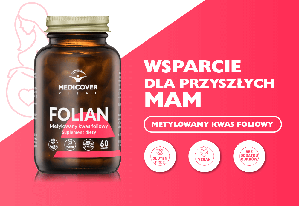 Folian od Medicover Vital to suplementy diety zawierający kwas foliowy w aktywnej formie, gotowy do przyswojenia przez organizm. Preparat stanowi wsparcie w prawidłowym przebiegu ciąży i dba o prawidłowy rozwój płodu. Ponadto zmniejsza uczucie zmęczenia i znużenia.