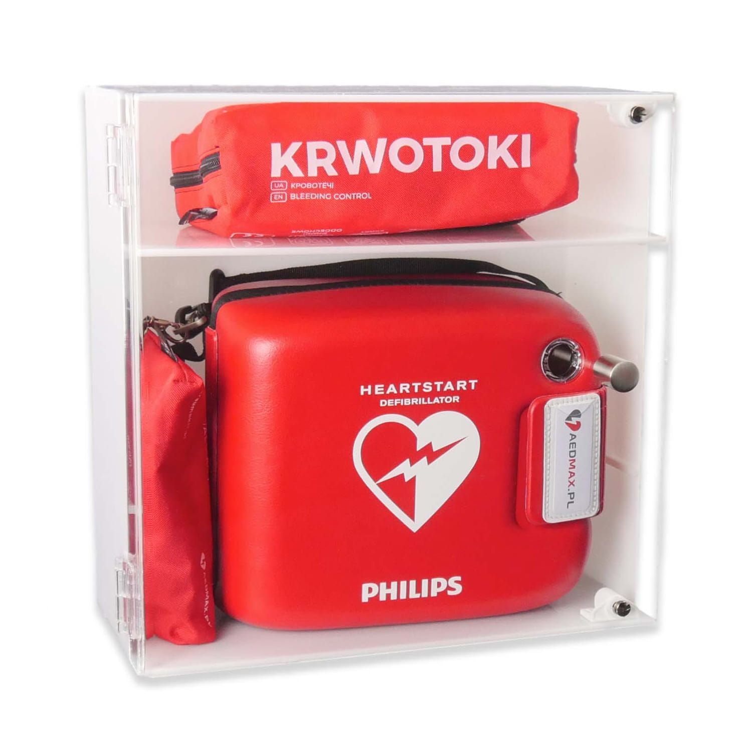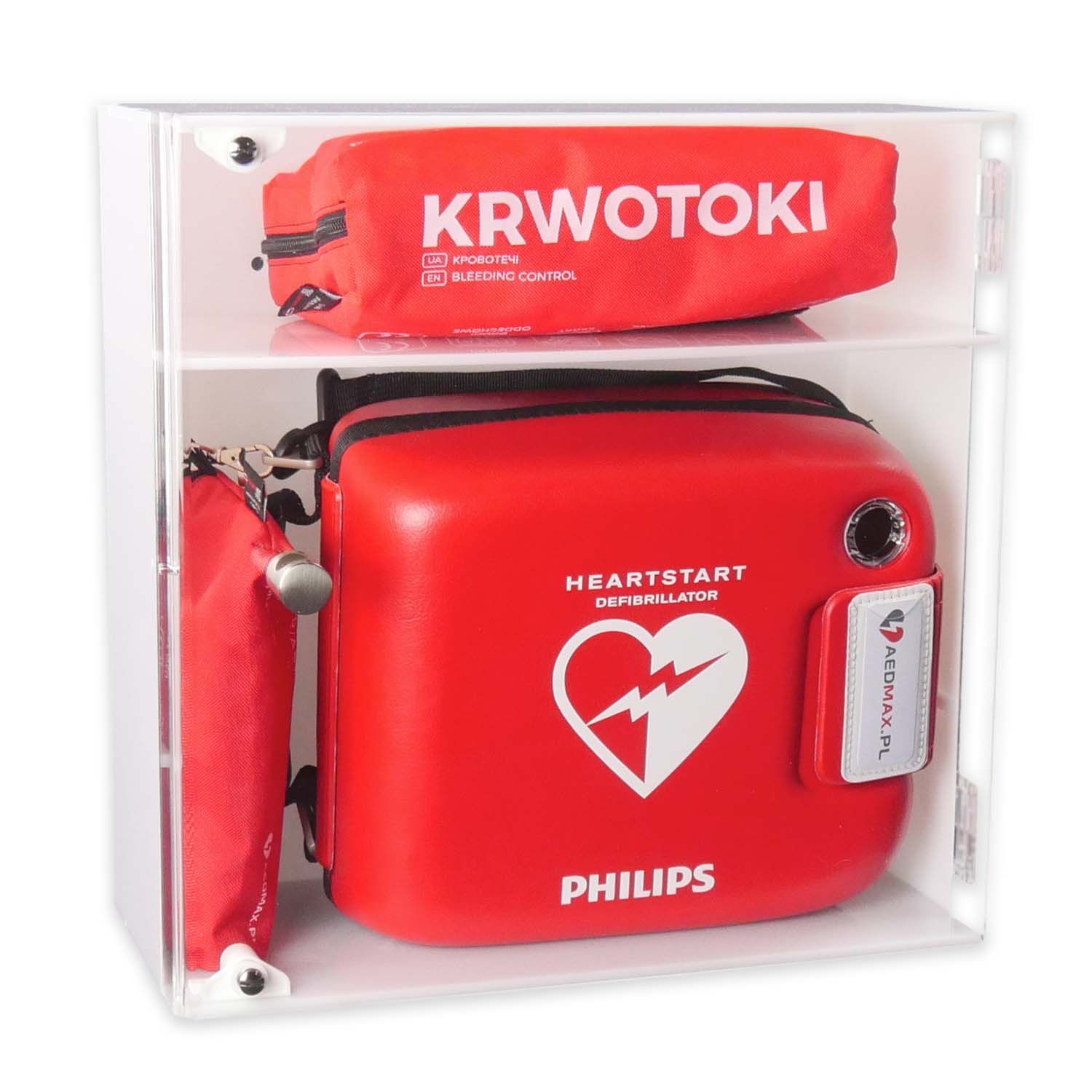 Rekomendujemy zakup gabloty wraz z defibrylatorem Philips FRx i Modułem Krwotoki. Taki zestaw jest doskonałym zabezpieczeniem dającym możliwość sprawnej reakcji na większość zagrażających życiu sytuacji takich jak nagłe zatrzymanie krążenia i odwracalną przyczynę nagłego zatrzymania krążenia, czyli masywny krwotok. Słowem zestaw doskonały.