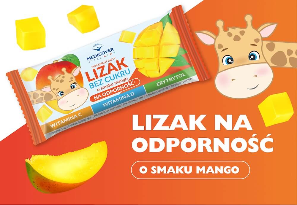 Medicover Vital Kids Lizak na odporność, bez cukru, o smaku mango to suplement diety wzbogacony o witaminy D i C, które wspierają prawidłowe funkcjonowanie układu odpornościowego. Ponadto pozytywnie wpływa na kości i zęby. Produkt przeznaczony jest dla dorosłych i dzieci powyżej 3. roku życia.