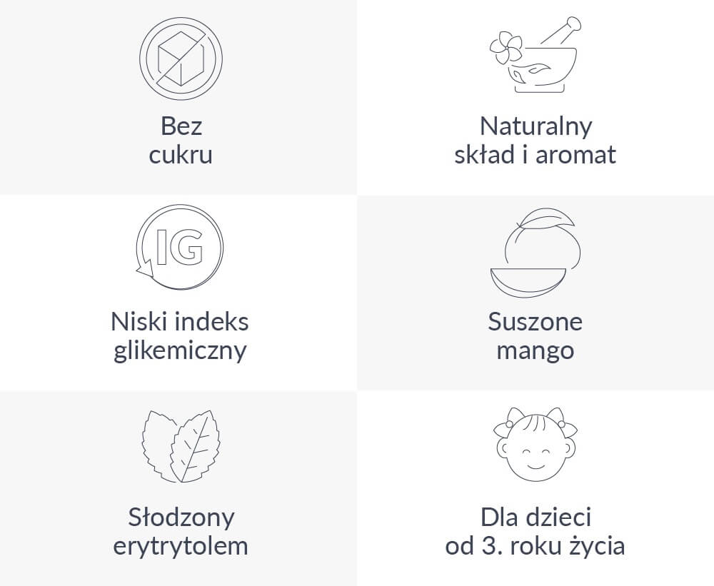 Suplement diety w formie pudrowych lizaków w swoim składnie nie zawiera cukru. W jego miejsce zastosowane substancje słodzące - erytrytol i stewię - południowo-amerykańską roślinę o bardzo niskim indeksie glikemicznym, 300 razy słodszym od cukru. Dzięki tym składnikom lizak nie dostarcza zbędnych kalorii, a dodatkowo został wzbogacony o naturalny aromat mango.