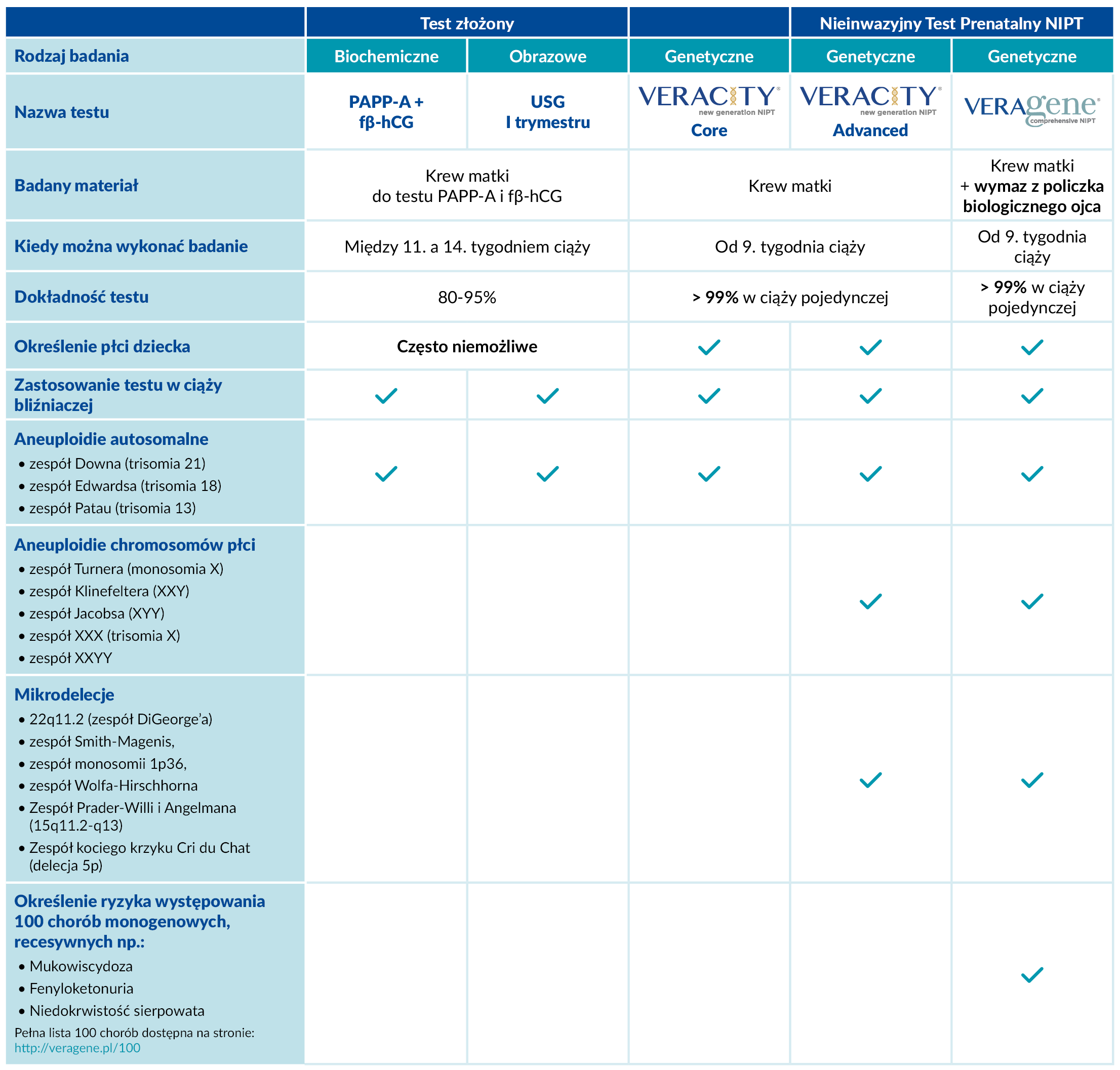 VERAgene to pierwsze tak kompleksowe nieinwazyjne, przesiewowe badanie prenatalne (NIPT) pod kątem aneuploidii, mikrodelecji i mutacji punktowych.