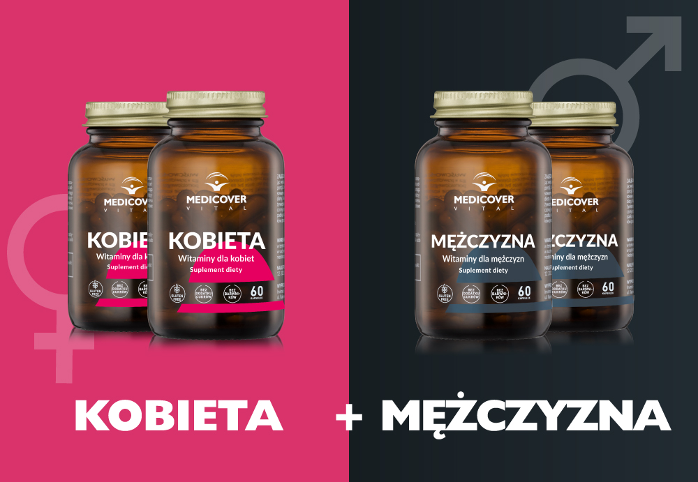 Zestaw zawiera 2 buteleczki suplementu Medicover Vital Kobieta 2 buteleczki suplementu Medicover Vital Mężczyzna, co wystarcza na 60 dni stosowania.