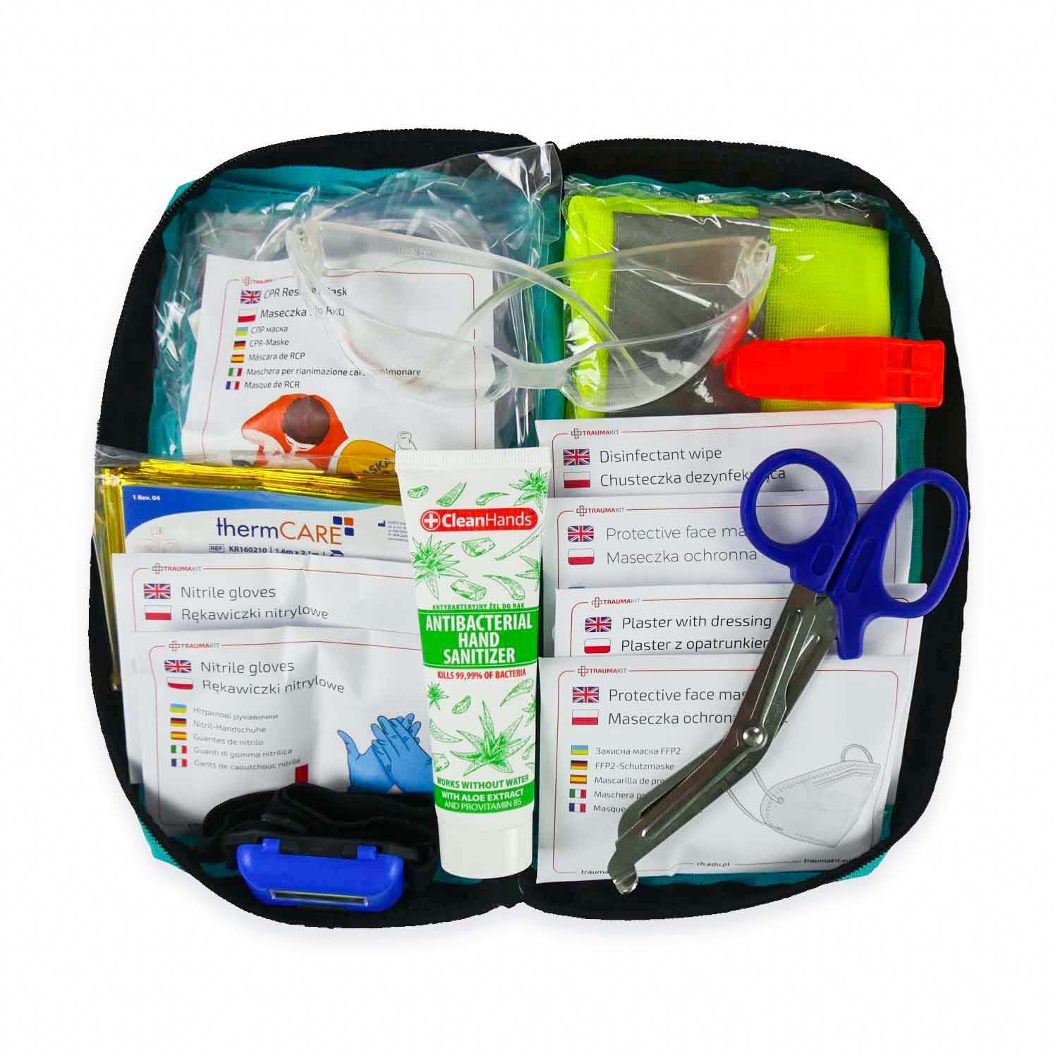 Dzięki TRAUMA KIT RKO/Ochrona Osobista masz pewność, że wykonywanie pierwszej pomocy będzie bezpieczne. Cały skład gwarantuje profesjonalne wykonanie pierwszej pomocy, zarówno dla służb ratownictwa medycznego, jak i w domu, biurze czy podróży.